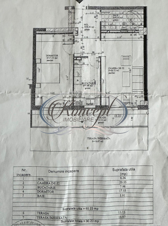 Koncept Imobiliare va ofera spre vanzare un apartament cu 2 camere decomandate, situat in ansamblul rezidential Bonjour, din cartierul Buna Ziua, una dintre cele mai apreciate zone rezidentiale din Cluj-Napoca, recunoscuta pentru infrastructura moderna, accesibilitate si proximitatea fata de facilitati urbane importante. Apartamentul este amplasat la parter inalt si beneficiaza de o suprafata utila de 60.23 mp, completata de doua terase generoase, respectiv o terasa clasica de 13 mp si o terasa inierbata de 17 mp, care ofera un spatiu exterior excelent pentru relaxare, activitati recreative sau zona verde privata. Compartimentarea este decomandata si eficient gandita, fiind compusa din living, dormitor, bucatarie separata, baie, hol si cele doua terase, fiecare cu acces facil din apartament. Spatiile sunt bine proportionate, luminoase si usor de utilizat, oferind un confort ridicat pentru locuire. Apartamentul este finisat modern si se vinde complet mobilat si utilat, fiind pregatit pentru mutare imediata fara investitii suplimentare. Finisajele si mobilierul sunt alese intr-un stil actual, functional si placut, integrandu-se perfect in conceptul ansamblului Bonjour. Printre punctele forte ale acestei proprietati se numara pozitionarea in ansamblu rezidential premium, existenta celor doua terase cu suprafata generoasa, compartimentarea decomandata, parterul inalt care ofera intimitate si acces facil, precum si faptul ca apartamentul este ideal atat pentru locuinta proprie, cat si pentru investitie, avand un potential foarte bun de inchiriere in zona Buna Ziua. Pentru informatii suplimentare, programarea unei vizionari sau pentru a afla oferta noastra completa va stam la dispozitie telefonic, prin e-mail sau la sediul agentiei noastre, pe str. Aviator Badescu, nr. 19, Cluj-Napoca.