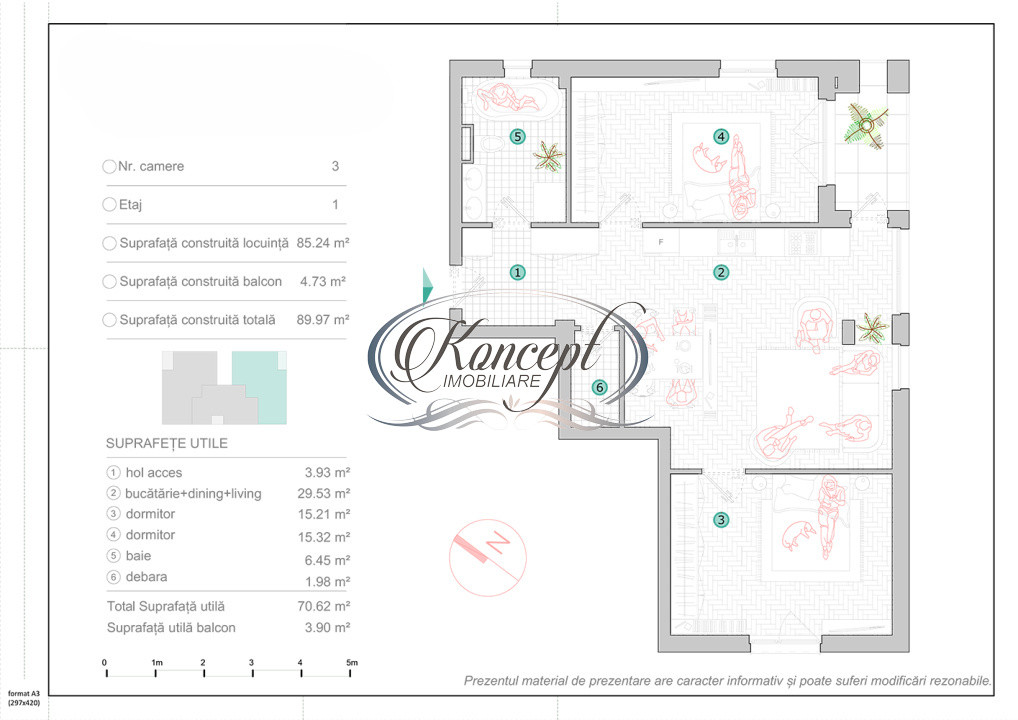 Koncept Imobiliare va ofera spre vanzare un apartament modern, intr-un complex rezidential smart house de tip boutique, intim, format din doar doua cladiri, fiecare cu cate 9 apartamente, amplasat pe Strada Oasului, in proximitate de CREIC. Apartamentul este situat la parterul inalt al imobilului (demisol destinat parcarilor, apoi P+1+etaj retras), intr-o zona accesibila, cu conexiuni rapide spre punctele importante din oras, beneficiind de orientare Sud-Vest, ideala pentru lumina naturala si confort pe tot parcursul zilei. Proprietatea are suprafata utila de 62.11 mp, la care se adauga o logie de 2.70 mp. Compartimentarea este eficienta si echilibrata: hol, living cu bucatarie open-space, 2 dormitoare, baie si un dressing dedicat, un plus important pentru organizare si spatii de depozitare in interiorul apartamentului. Se preda la stadiul de semifinisat, cu sapa, doua maini de glet si instalatiile trase pe pozitii, oferind flexibilitate pentru amenajare dupa preferintele viitorului proprietar. Apartamentul se diferentiaza prin pachetul complet de tehnologie si eficienta: incalzire in pardoseala, centrala pe bloc cu contorizare separata, panouri fotovoltaice pentru consumul comun si clasa energetica A, pentru costuri optimizate. Sistemul smart include termostat smart, interfon, control acces, usa smart la intrarea in bloc, senzori de lumina, senzor de inundatie, senzor de prezenta, usa smart la intrarea in apartament, casute postale smart, control pentru incalzire si racire, plus instalatii pregatite pentru automatizari suplimentare. Constructia este realizata din caramida, cu izolatie din polistiren grafitat, fatada cu caramida aparenta, tamplarie PVC cu geamuri termopan tripan cu protectie UV si un nivel de antifonare ridicat, completate de zone verzi amenajate in jurul imobilului. Accesibilitatea este un avantaj major pentru un apartament pe Strada Oasului: statie de autobuz la 1 minut de mers pe jos, aproximativ 2 km pana la CREIC Cluj, 2.5 km pana la Auchan Iris, 6 km pana in centrul orasului (Piata Unirii), 7 km pana la Emerson si 10 km pana la Aeroport. Parcarile subterane se pot achizitiona separat, in functie de necesitate. Aceasta proprietate se recomanda celor care isi doresc un apartament smart in zona Oasului, cu orientare buna, comunitate restransa si eficienta energetica ridicata, potrivit atat pentru locuire pe termen lung, cat si pentru investitie, avand in vedere proximitatea fata de hub-uri de business si infrastructura urbana. Termen estimat pentru finalizarea constructiei: martie 2026, iar CF-urile sunt preconizate pentru iunie 2026. Actele au fost verificate si validate de catre agentie. Pentru informatii suplimentare, programarea unei vizionari sau pentru a afla oferta noastra completa va stam la dispozitie telefonic, prin e-mail sau la sediul agentiei noastre, pe str. Aviator Badescu, nr. 19, Cluj-Napoca.