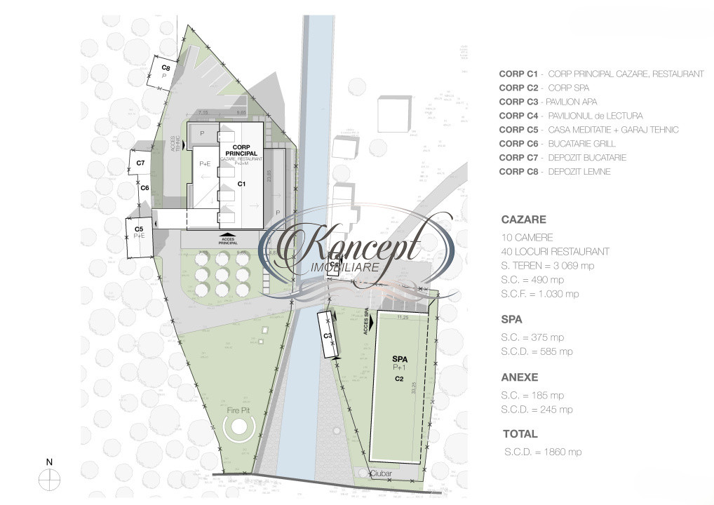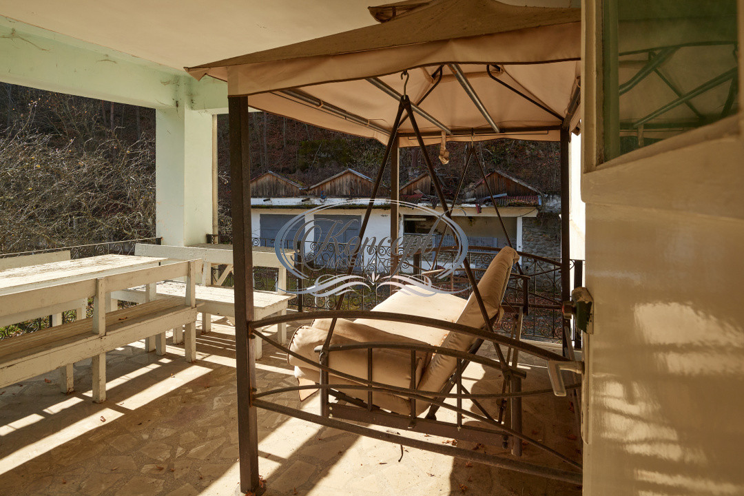 Pe una dintre parcele este organizata zona de acces auto si parcare, unde se afla doua corpuri de cladire intabulate, cu o suprafata construita de aproximativ 125 mp, ideale pentru functiuni viitoare de spa, piscina, sauna sau salina, conform conceptului existent. Pe cealalta parcela, peste un pod de piatra amenajat peste parau, se afla cabana principala de aproximativ 320 mp utili, cu cinci camere, trei bai, un living generos si sala de mese dispuse pe doua niveluri, doua terase acoperite de aproximativ 25 mp fiecare si cinci anexe intabulate (camera tehnica, depozite de lemne, spatiu pentru barbeque si alte spatii de depozitare).