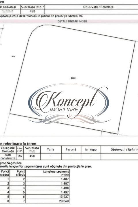 Koncept Imobiliare va ofera spre vanzare un teren intravilan situat in cartierul Faget, zona hotel Stil, intr-o arie rezidentiala apreciata pentru liniste, aer curat si proximitatea padurii. Parcela este retrasa de la strada principala, intr-un context urban aerisit, cu locuinte individuale noi si vecinatati exclusiv rezidentiale. Terenul are suprafata de 458 mp cu front de 21 m, forma regulata, panta foarte mica si beneficiaza de soare pe intreaga durata a zilei. Din punct de vedere urbanistic, parcela dispune de PUZ aprobat si este in curs de autorizare pentru constructia unei case individuale. Regimuri permis este: (S)+P+1+M, (S)+P+1+R, D+P+M sau D+P+R. Proiectul disponibil, in acest stadiu poate fi personalizat in functie de preferintele viitorului proprietar. Utilitatile includ canalizare trasa pana la limita proprietatii, iar apa, gazul si curentul electric se afla la aproximativ 30–40 metri. Accesul este facil, iar nivelul de zgomot este foarte redus, fara trafic intens sau activitati comerciale in proximitate. Printre punctele forte se remarca pozitionarea intr-una dintre cele mai cautate zone de case din Faget, cadrul natural oferit de apropierea padurii, accesul privat, documentatia urbanistica clara si pretul foarte competitiv raportat la piata zonei. Pentru informatii complete, programarea unei vizionari sau pentru a afla oferta noastra completa va stam la dispozitie telefonic, prin e-mail sau la sediul agentiei noastre, pe str. Aviator Badescu, nr. 19, Cluj-Napoca.